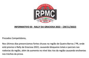 Após mudança de roteiro, data e de programação, A Prefeitura Municipal de Quatro Barras revogou a autorização para realização do Rally da Graciosa, previsto para os dias 13 e 14 de janeiro.